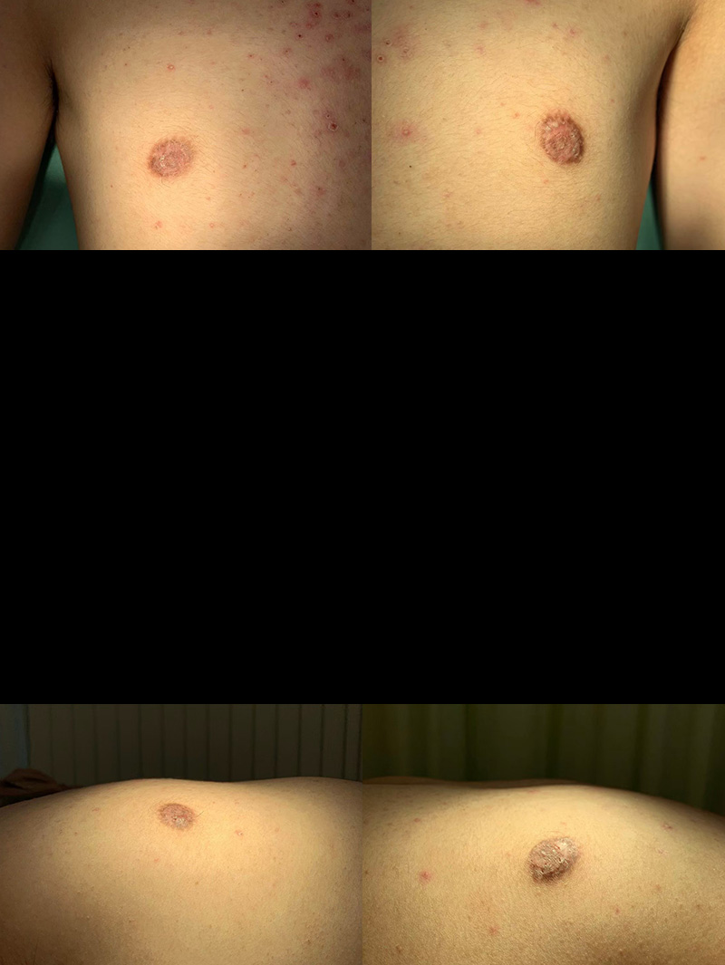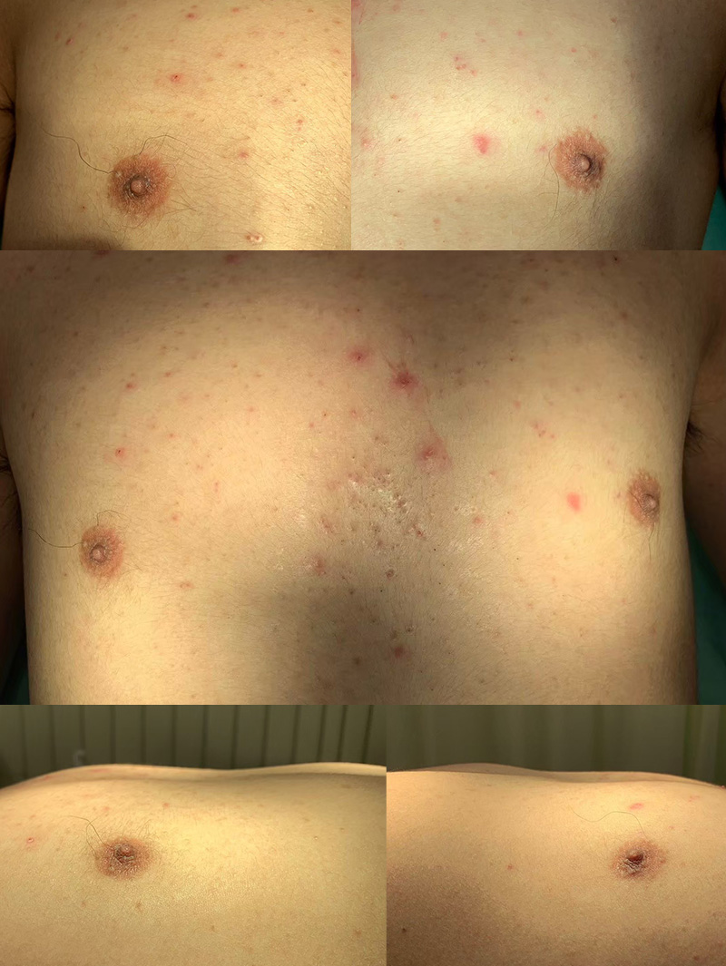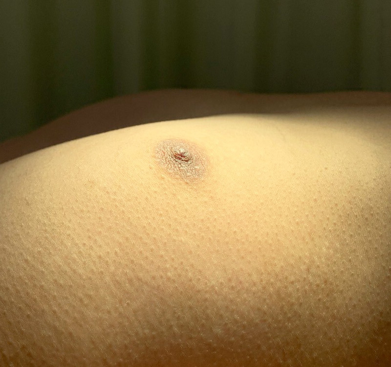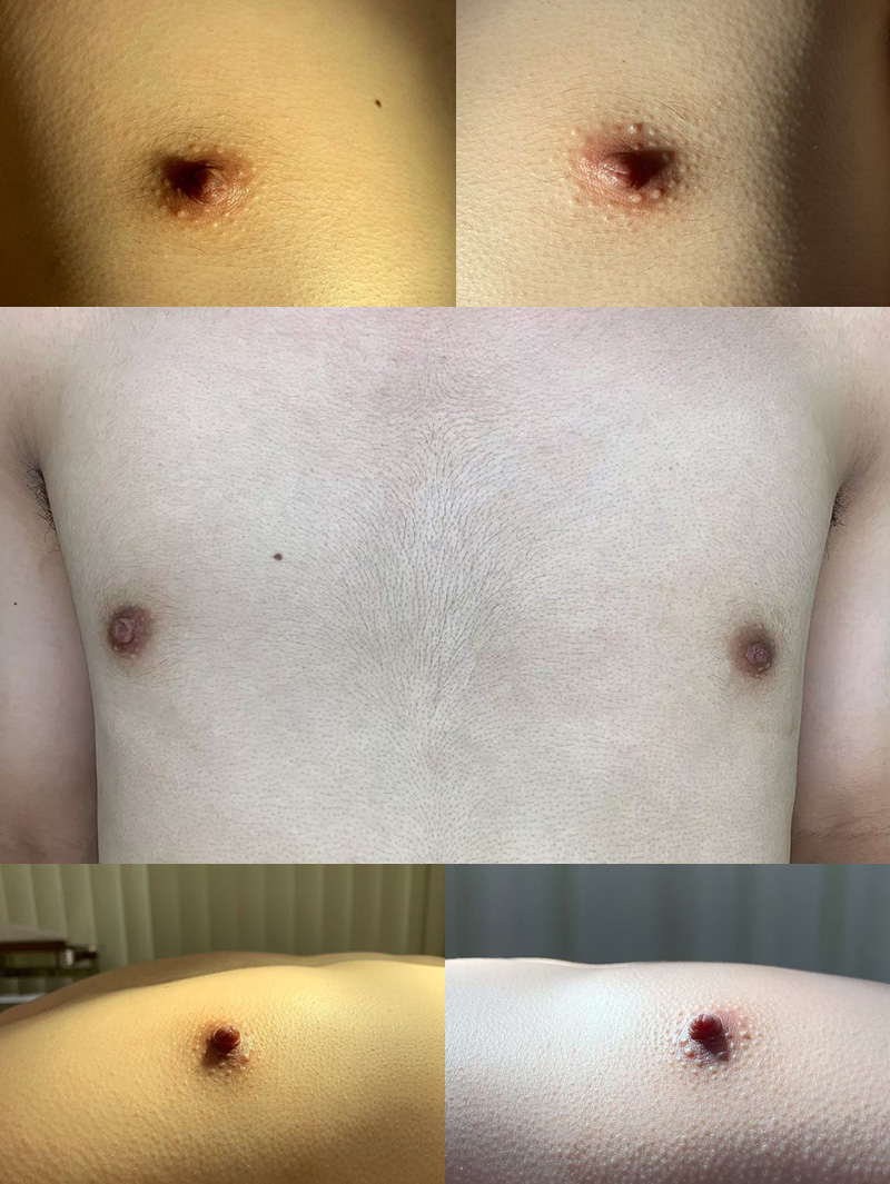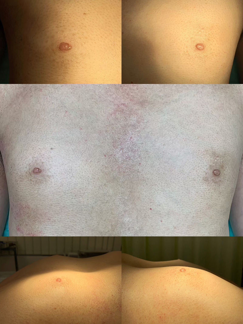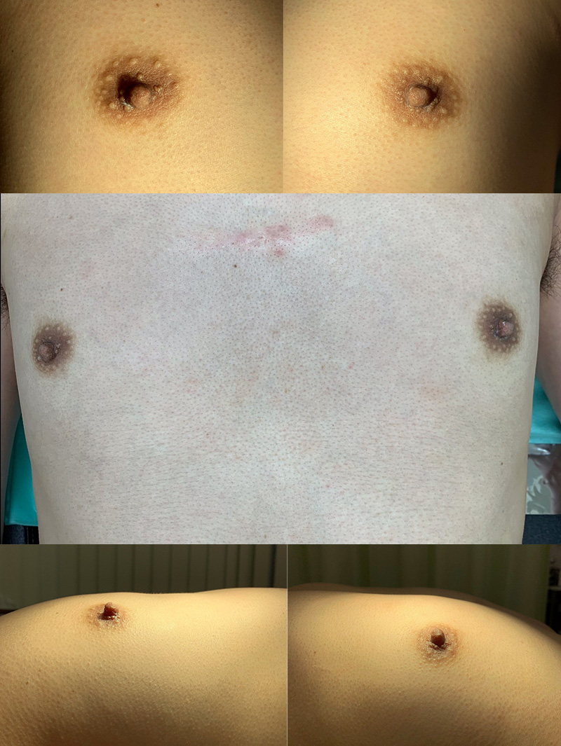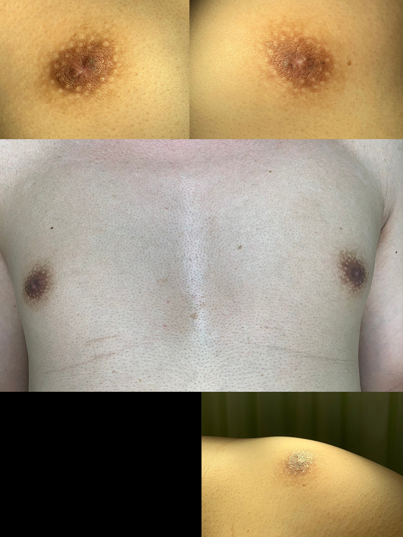 乳頭が高く、Tシャツからシルエットが浮き出ることが悩み。乳頭の完全切除を希望して来院。